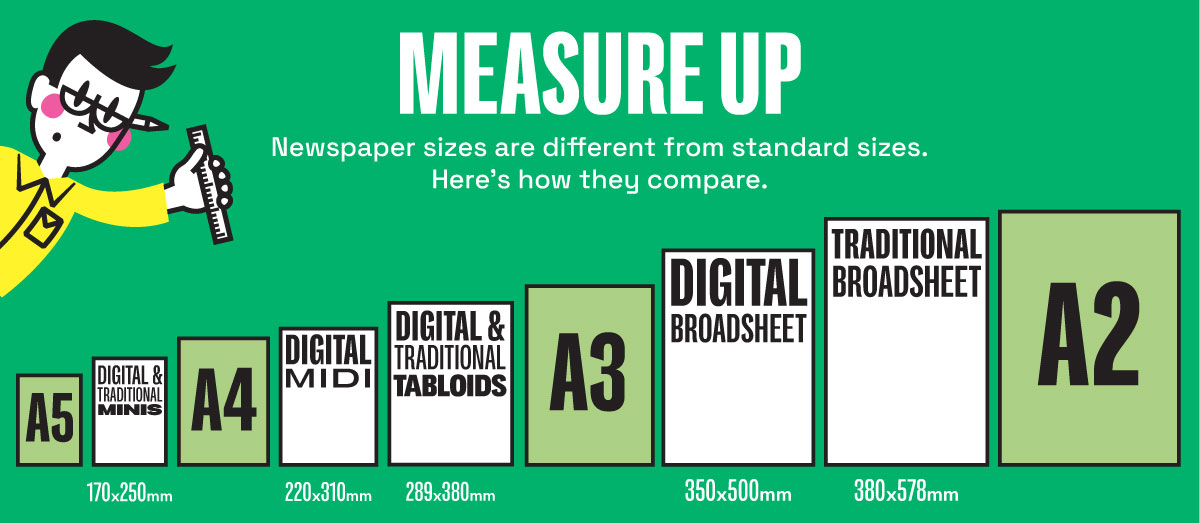 There are four newspaper sizes to suit all kinds of projects. Here’s how they compare to standard European sizes and how to pick the right one.
